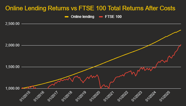 In 2025, while P2P and online lending made “just” 6.77% after costs and write-offs, the stock market returned a huge 24.5%(1) for investors, after estimated investing costs.